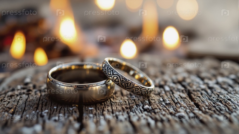 Закрытие двух обручальных колец на деревенской деревянной поверхности, одно классическое золото и одно с богато украшенным гравированным узором, светящийся романтический огонь на заднем плане