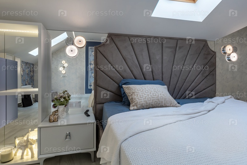 Крупный план роскошной чердачной спальни с серым бархатным изголовьем, минималистской белой тумбочкой с декоративной статуэткой слона и стильными современными настенными бражками