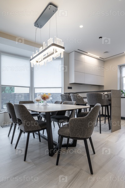 Роскошное обеденное пространство с мраморным столом, серыми обитыми стульями и потрясающей хрустальной люстрой. На заднем плане белая минималистская кухня и большие заливные окна с плиссированными жалюзи создают яркую современную атмосферу