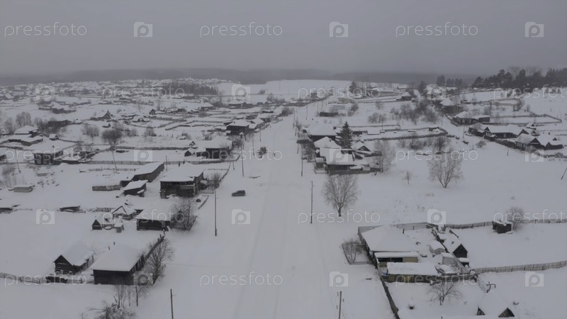 Вид на снежную птицу. Клип. Белая деревня в снегу с небольшими деревянными домами и рядом с ней большой лес с высокими деревьями