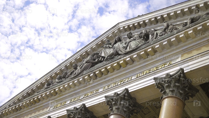 Нижний вид на колонны собора в Санкт-Петербурге. Действуй. Красивые скульптуры на фронтоне и колонны старого собора. Величественный собор с колоннами на фоне неба