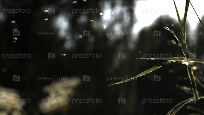 Миджеи летают в вечернем зеленом поле под солнечным светом. Творческий. Многие мелкие насекомые собираются в одном месте перед зелеными деревьями