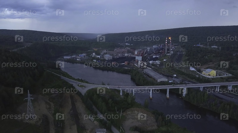 Воздушный беспилотный ландшафт небольшой деревни с рекой и зелеными лесистыми горами. Клип. Мост, пересекающий два берега реки на облачном фоне