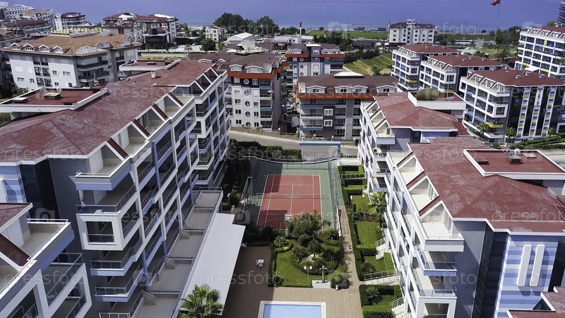 Вид с курортной зоны с дрона. Клип. Чистое голубое море с огромными домами и зонами отдыха видны на заднем плане