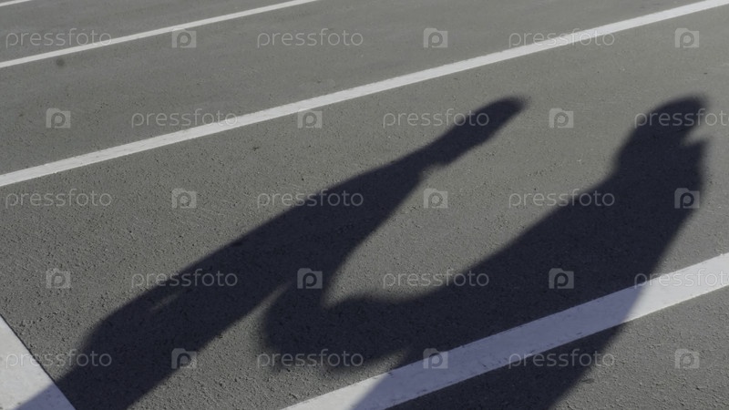Силуэты двух молодых людей во время сердитого конфликта. HDR. Тени спорящих друзей друг с другом на фоне парковочного асфальта