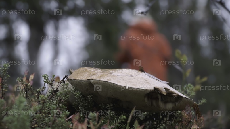 Гриб, растущий среди травы и мха крупным планом. КЛИП. Девушка в красной куртке проходит мимо гриба на заднем плане