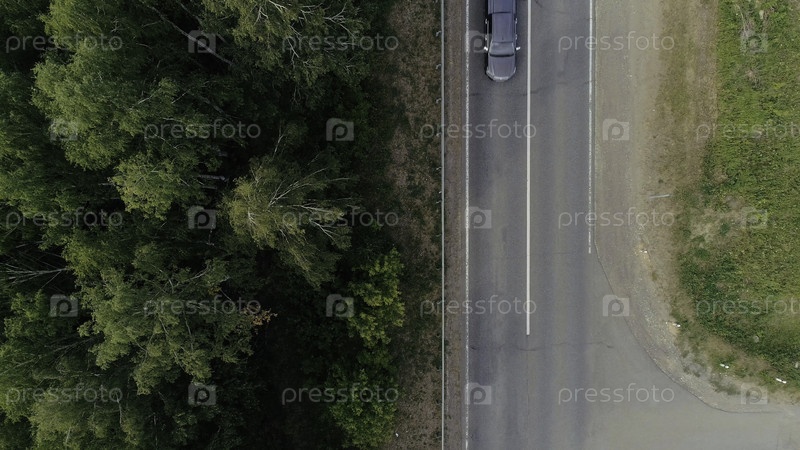 Вид с вертолета. Сцена. Узкая дорога, по которой едут грузовой автомобиль с синим фронтом и автомобиль с прицепом для перевозки, есть лес и дорога с травой рядом