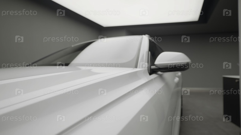 Белое тело автомобиля. Действуй. Яркая машина с окном и зеркалами и красивым чистым кузовом, стоящая в красивом месте со светом