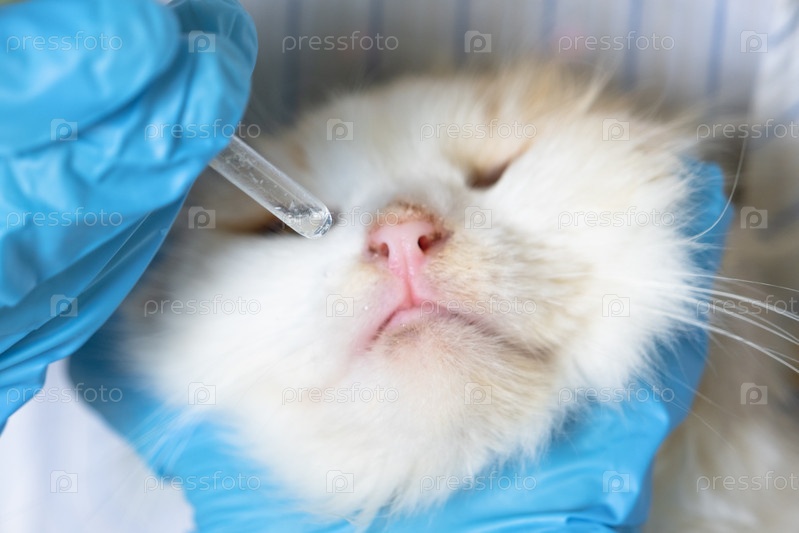 Ветеринар в резиновых перчатках бросает лекарство от простуды в нос кошки. Лечение простуды и аллергии дома