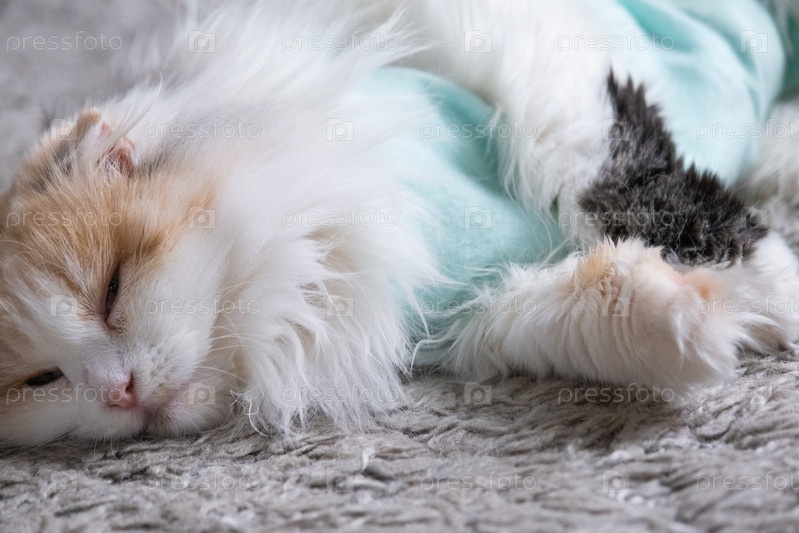 Белый кот в повязке дома восстанавливается после анестезии после операции по стерилизации, спит