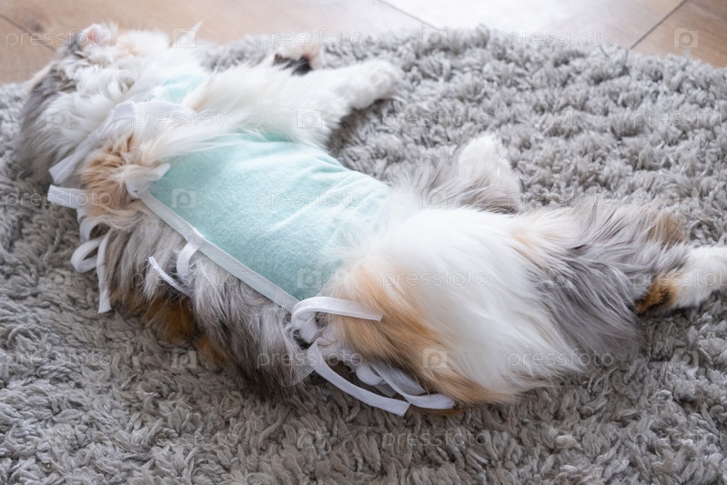 Белый кот в повязке дома восстанавливается после анестезии после операции по стерилизации, спит