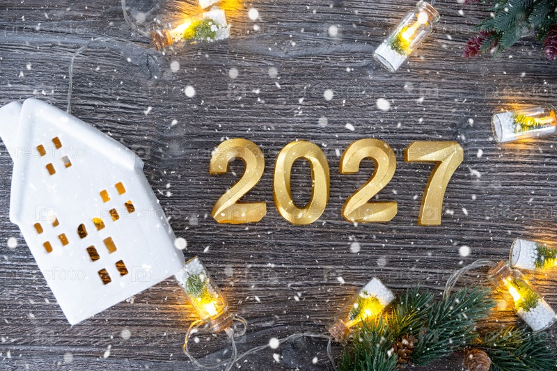 Новый год 2027 золотые номера и ключ Дома с крохотной формой дома на праздничном сером деревянном фоне плоскогорья, огни гирлянд, поздравительная открытка. Жилье, недвижимость, переезд, ипотека, страхование