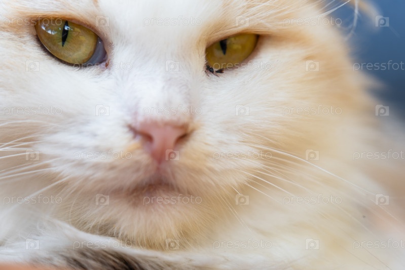 Лицо белой кошки с глазами с конъюнктивитом и сопли, крупным планом. Ветеринарная медицина