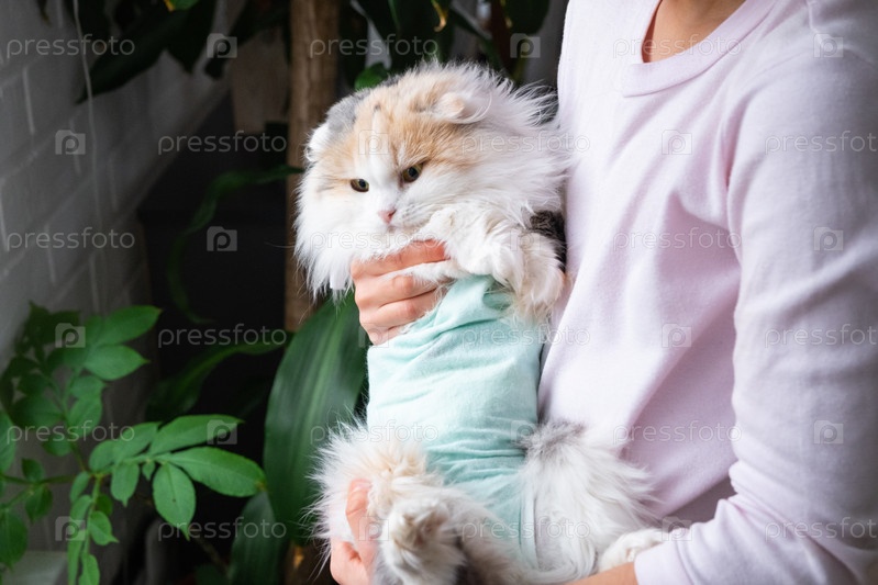 Триколор Кошка в повязке дома восстанавливается после операции по стерилизации на руках хозяина