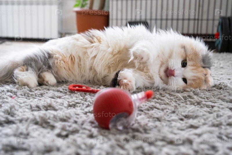 Нагорье Складная домашняя кошка играет на коврике с подвижным мячом и струной. Развлечения и домашние игрушки