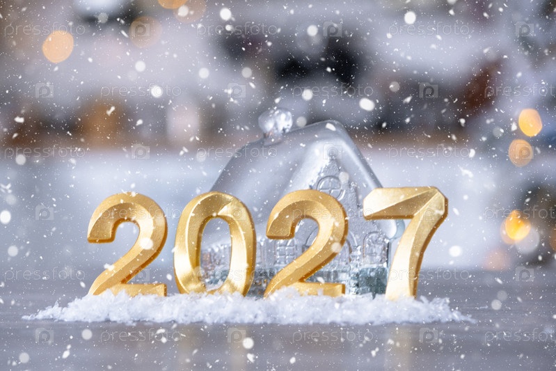 Золотые цифры 2027 года на фоне крошечного дома с теплым светом и гирляндами. Приветственная открытка, С Новым годом, уютный дом