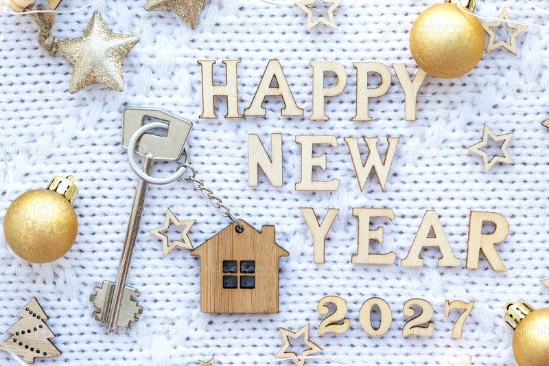 Ключ от дома с кейчейном коттеджем на праздничном фоне со звездами, огнями гирлянд. Новый год 2027 деревянные письма, поздравительная открытка. Покупка, строительство, переселение, ипотека, страхование