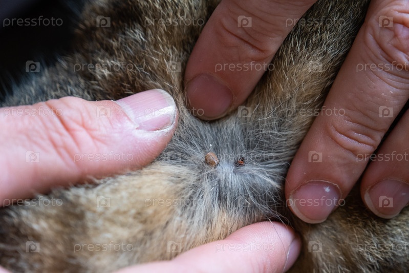 Клещ вгрызался в кожу кошки под мехом, удаляя клеща
