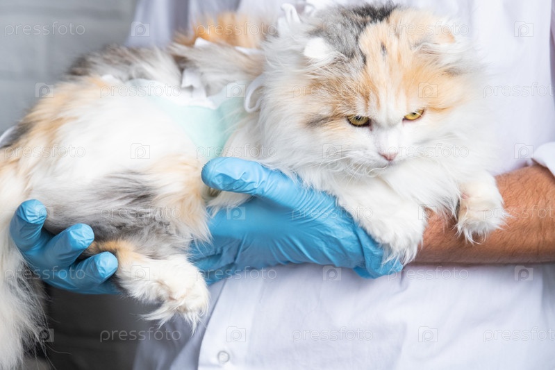 Кошка в повязке на руках ветеринара в синих резиновых перчатках. Проверка домашних животных после операции по стерилизации