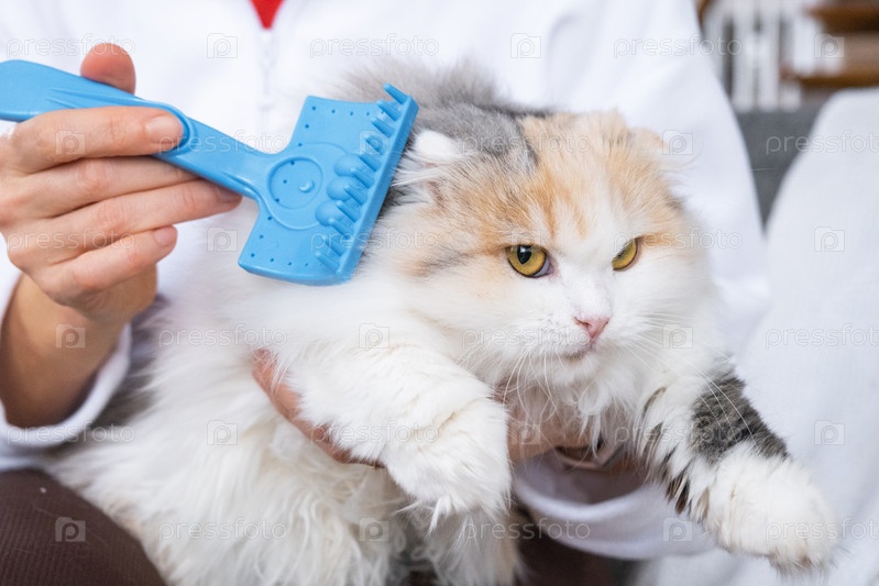 Объедините белую домашнюю кошку крупным планом, ухаживая за ее мехом гребнем. Кошка любит расчесывать