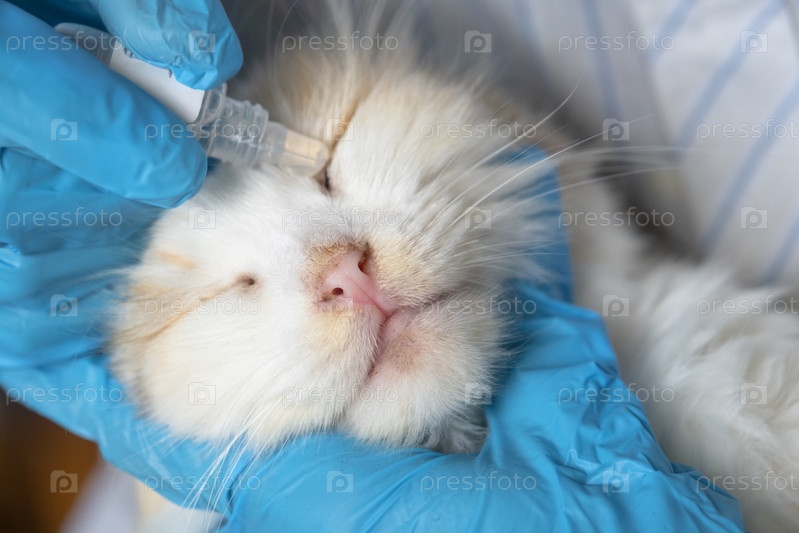 Ветеринар в резиновых перчатках бросает лекарство от конъюнктивита в глаз кошки. Лечение домашних животных дома