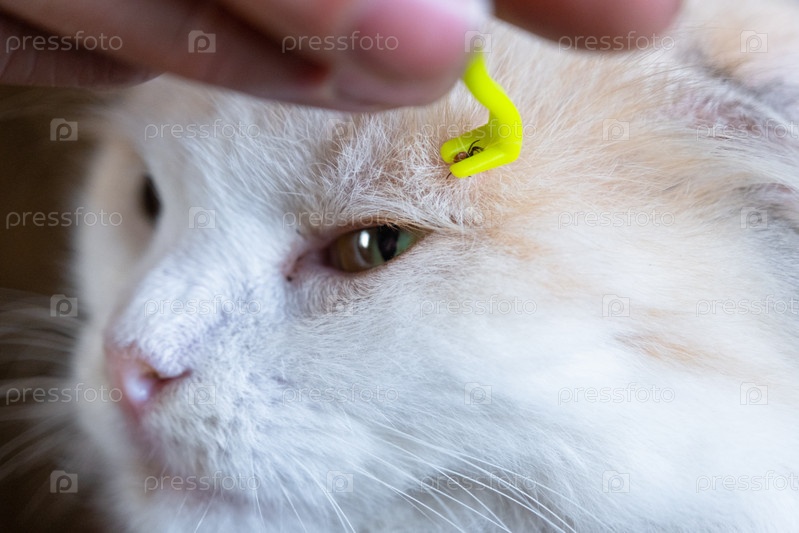 Щипцы для удаления клеща из кожи кошки крупным планом