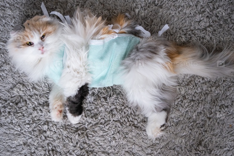 Триколор Кошка в повязке дома восстанавливается после операции по стерилизации