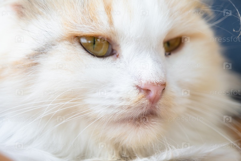 Лицо белой кошки с глазами с конъюнктивитом и сопли, крупным планом. Ветеринарная медицина