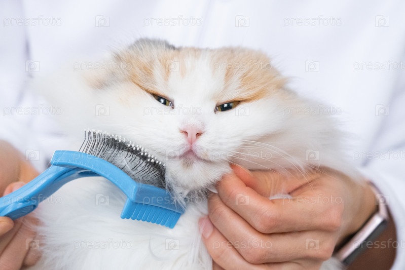Объедините белую домашнюю кошку крупным планом, ухаживая за ее мехом гребнем. Кошка любит расчесывать