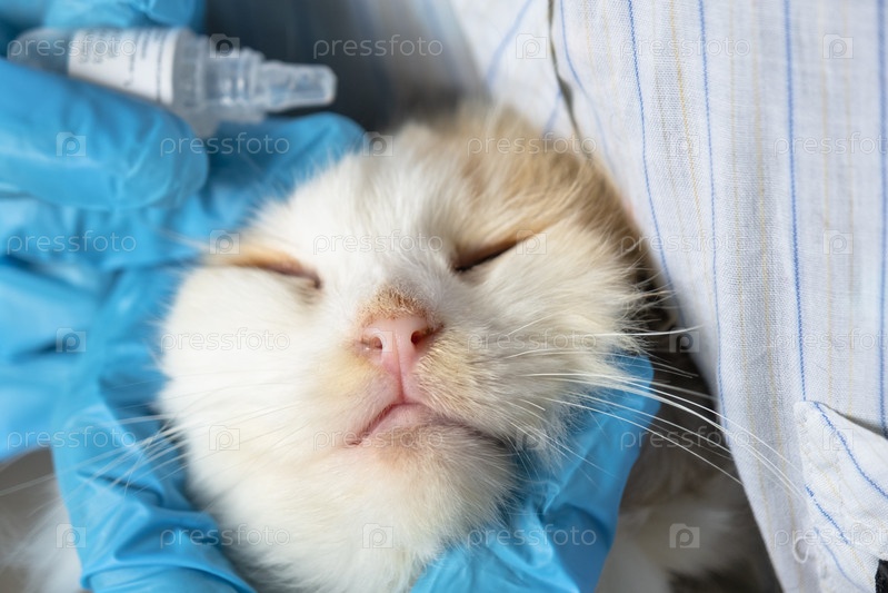 Ветеринар в резиновых перчатках бросает лекарство от конъюнктивита в глаз кошки. Лечение домашних животных дома