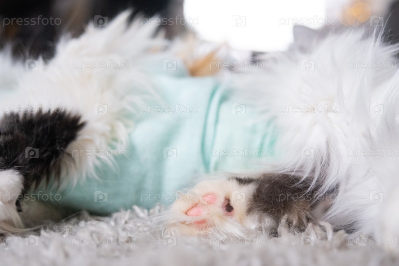 Белый кот в повязке дома восстанавливается после анестезии после операции по стерилизации, спит