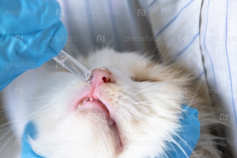 Ветеринар в резиновых перчатках бросает лекарство от простуды в нос кошки. Лечение простуды и аллергии дома