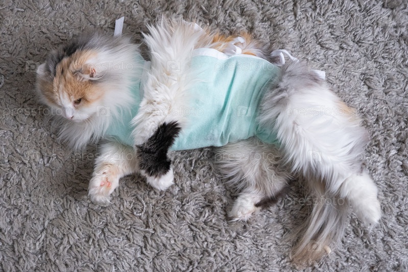 Белый кот в повязке дома восстанавливается после анестезии после операции по стерилизации, спит