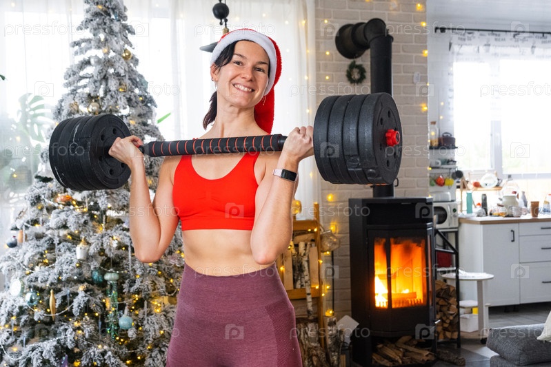 Женщина в спортивной форме и шляпе Санта занимается фитнесом и силовыми тренировками со штангой дома в рождественском интерьере с елкой. Восстановление спортивной формы после Нового года
