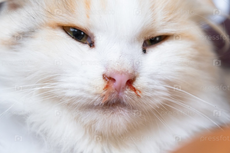 Кровавые сопли из носа белой кошки, ветеринарное лечение аллергии, насморк, повреждение носовой перегородки, воспаление и инфекция