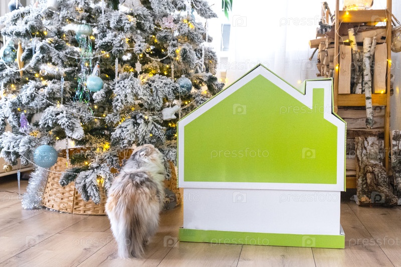 Рождественская елка украшает крошечный домик небольшого размера и кошку в интерьере дома. Подарок на Новый год, Дом домашних животных. Страхование, переезд в новый дом, ипотека, аренда и покупка недвижимости