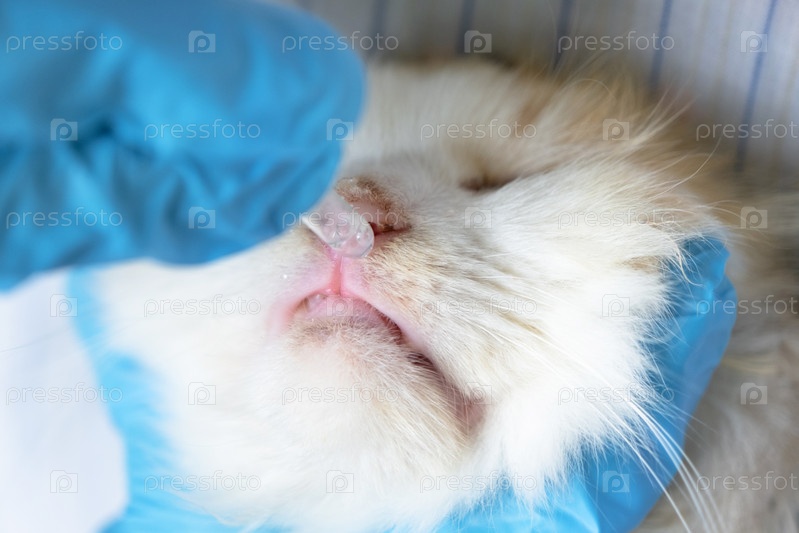 Ветеринар в резиновых перчатках бросает лекарство от простуды в нос кошки. Лечение простуды и аллергии дома