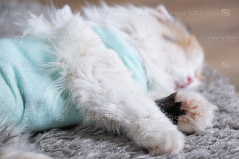 Белый кот в повязке дома восстанавливается после анестезии после операции по стерилизации, спит