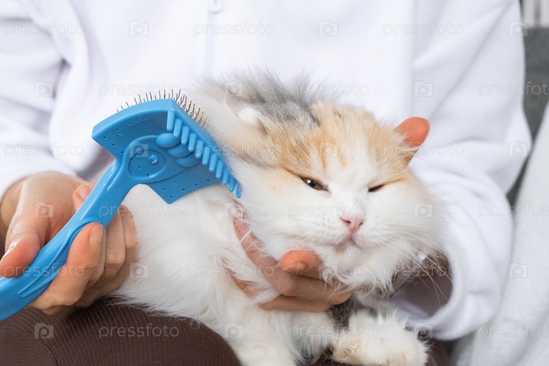 Объедините белую домашнюю кошку крупным планом, ухаживая за ее мехом гребнем. Кошка любит расчесывать