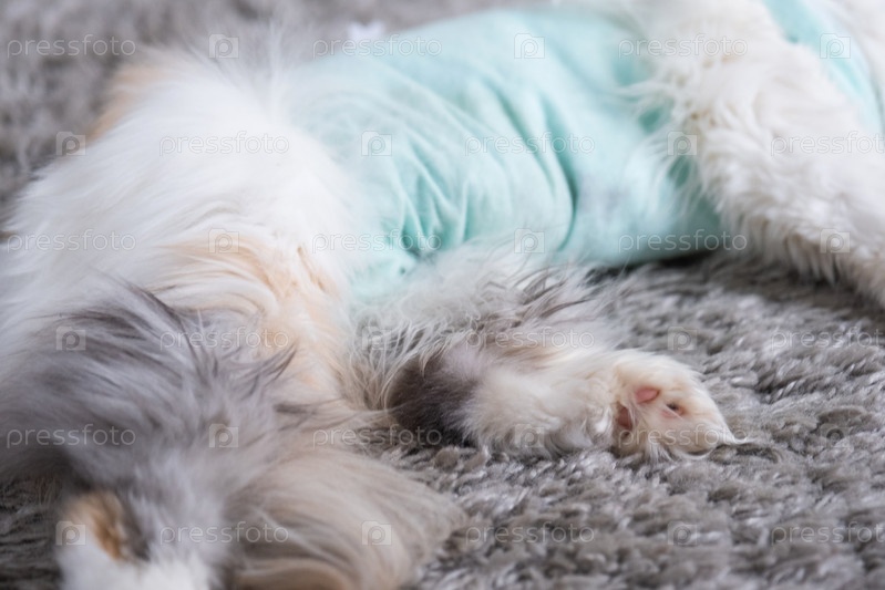Белый кот в повязке дома восстанавливается после анестезии после операции по стерилизации, спит