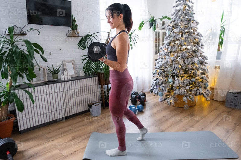 Женщина в спортивной форме занимается фитнесом и силовыми тренировками с гантелями дома в рождественском интерьере с елкой. Подготовка и восстановление спортивной формы после Нового года