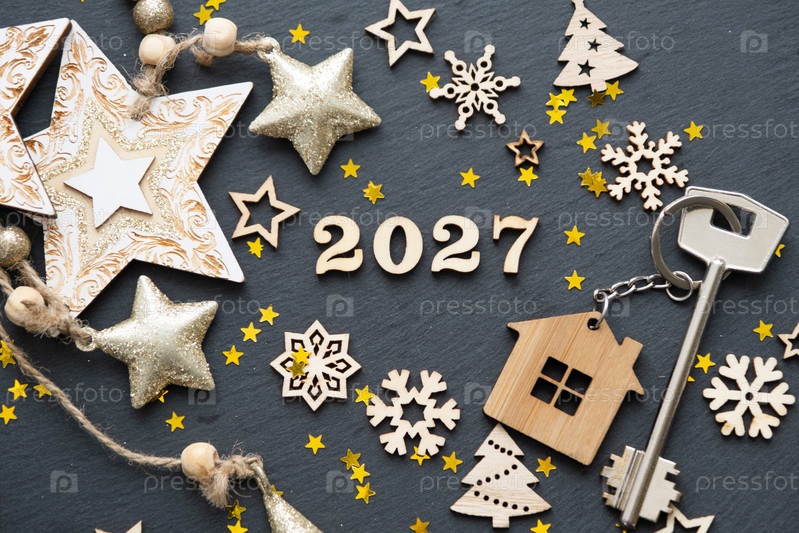 Ключ от дома с кейчейном коттеджем на праздничном черном фоне со звездами, огнями гирлянд. Новый год 2027 деревянные письма, поздравительная открытка. Покупка, строительство, переселение, ипотека, страхование