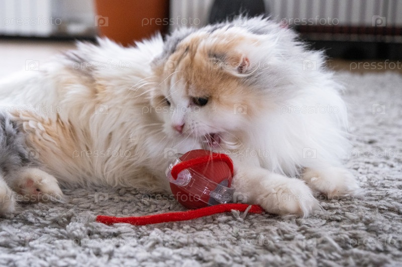 Нагорье Складная домашняя кошка играет на коврике с подвижным мячом и струной. Развлечения и домашние игрушки