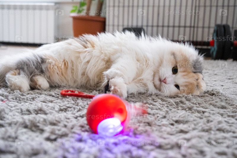 Нагорье Складная домашняя кошка играет на коврике с подвижным мячом и струной. Развлечения и домашние игрушки