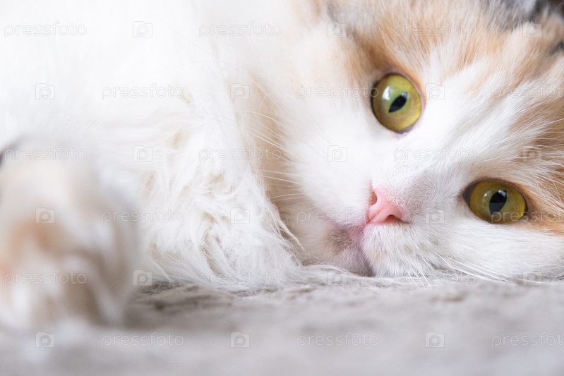 Белая кошка породы высокогорная складка смотрит в камеру, крупным планом морда с розовым носом и желтыми круглыми глазами