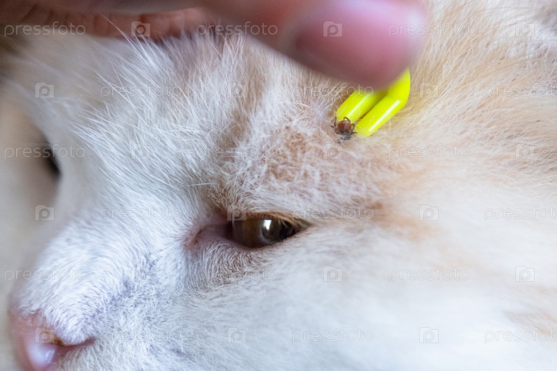 Щипцы для удаления клеща из кожи кошки крупным планом