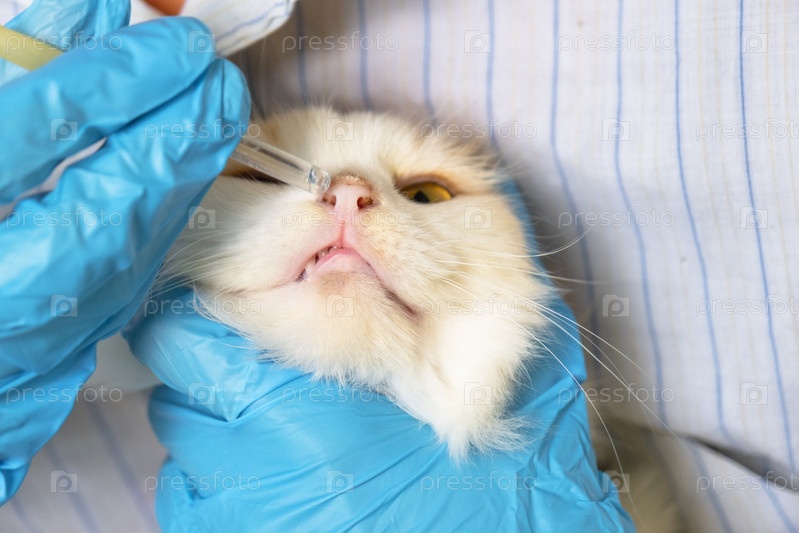 Ветеринар в резиновых перчатках бросает лекарство от простуды в нос кошки. Лечение простуды и аллергии дома