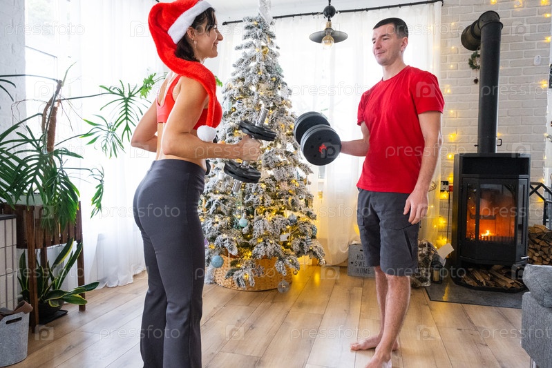 Женщина и мужчина в спортивной форме и шляпе Санта занимаются фитнесом и силовыми тренировками с гантелями дома в рождественском интерьере с елкой. Восстановление спортивной формы после Нового года