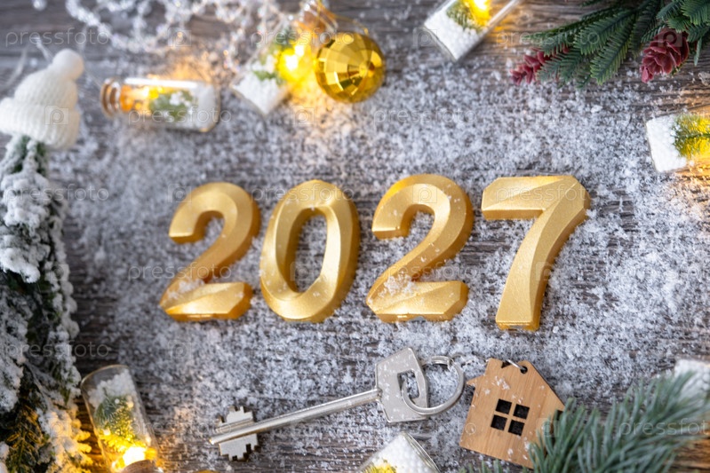 Новый год 2027 золотые номера и ключ Дома с крохотной формой дома на праздничном сером деревянном фоне плоскогорья, огни гирлянд, поздравительная открытка. Жилье, недвижимость, переезд, ипотека, страхование