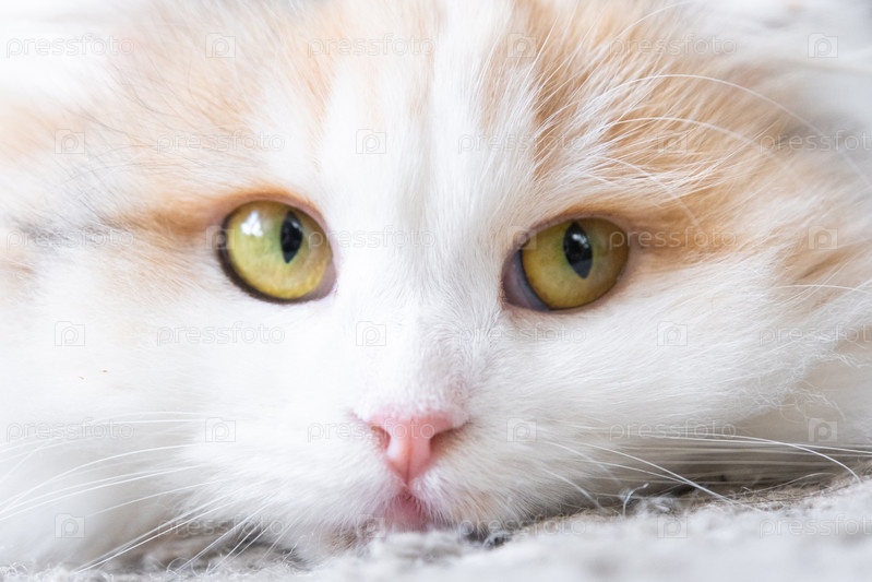 Белая кошачья порода высокогорная складка смотрит в сторону, крупным планом морда с розовым носом и желтыми круглыми глазами